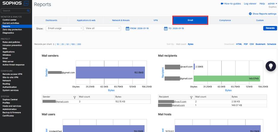 - Mail Report: Tìm kiếm lưu lượng Email, Spam và Virus. Có thể lọc theo protocol, user và các tiêu chí khác.
