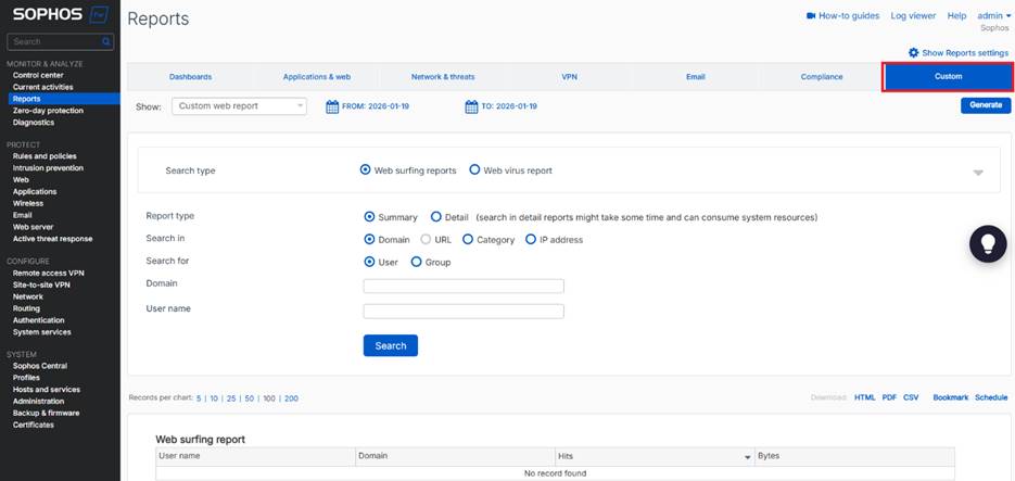- Web Report: Tìm kiếm hoạt động duyệt web hoặc virus. Có thể lọc theo user, domain và các tiêu chí khác